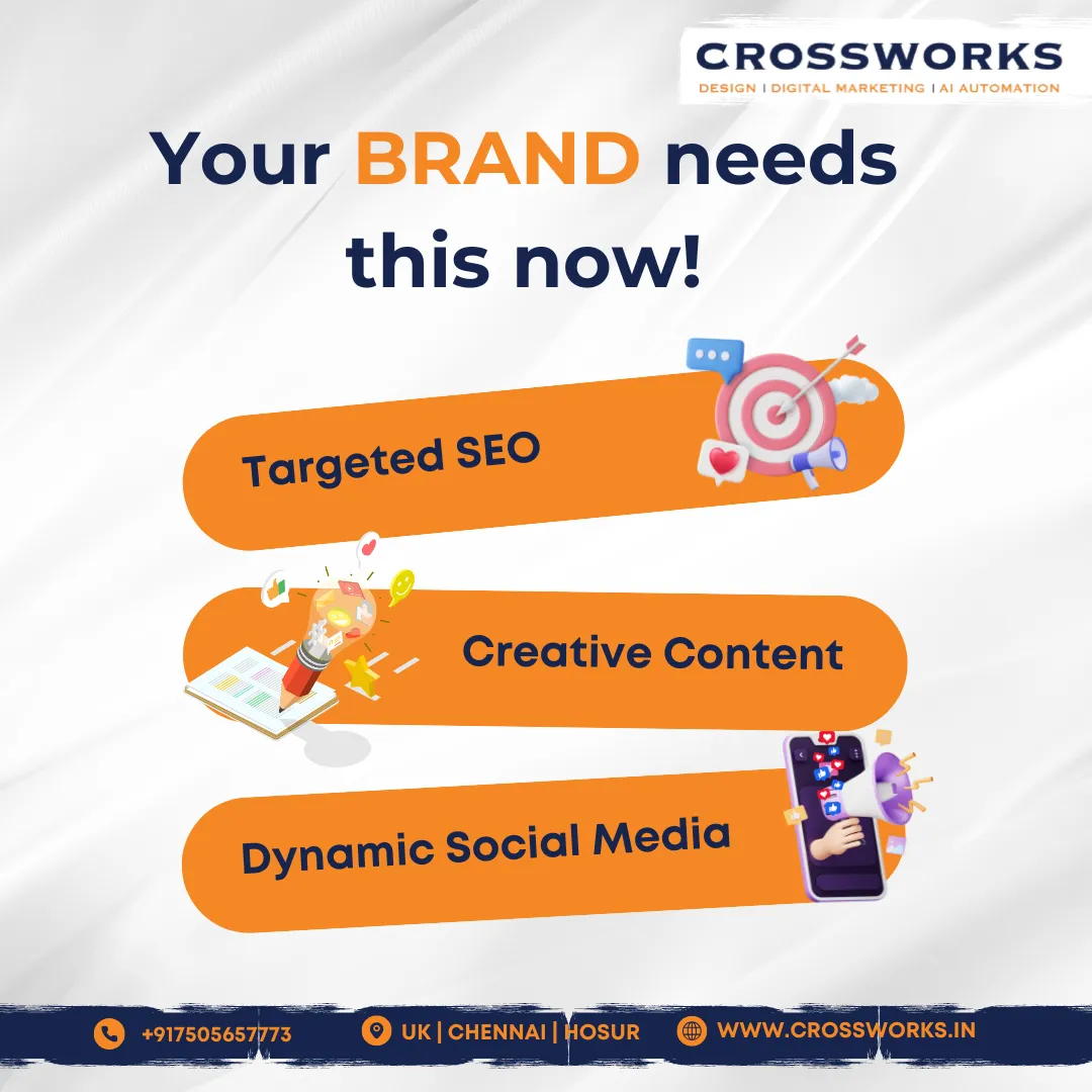 Crossworks Studio offers SEO (Search Engine Optimization)-optimized website development, Google Business Profile and Maps optimization, ROI-driven Google Ads management, strategic social media management, and high-converting Meta (Facebook & Instagram) ad campaigns for lead generation, e-commerce growth, brand awareness, retargeting, and full-funnel performance.